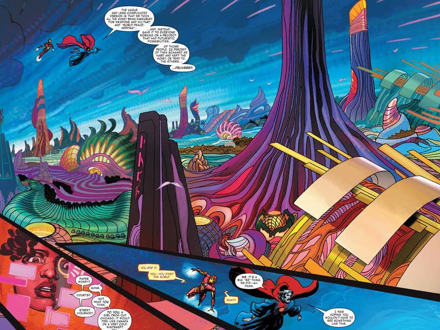 A brief encounter with Morgan LeFay leads us to realize the future isn’t all tulips and roses. Evil does exist but in sustainable amounts. A grown-up Franklin Richards is introduced in possession of a time machine. He is reluctant on using it to send Riri back to her original timeline.