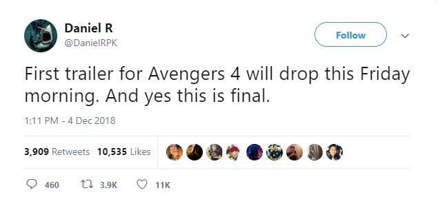 Now, as Daniel RPK, a popular Hollywood scooper who has been right about his Intel countless times has given us the trailer dates for both Avengers 4 and Spider-Man: Far From Home. As you can see above, he took it to twitter to announce the Spider-Man: Far From Home trailer which is coming out this Saturday, the 8th. Now there is no way that the Avengers 4 trailer could come after this, so yes you guessed it right. The big trailer is going to make its debut on Friday, the 7th.