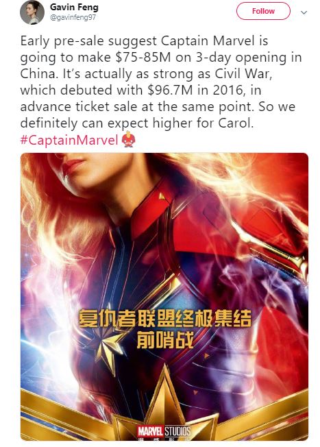 As proven especially by 2018, earnings from China play a very big role as they can make or break a particular film. Look at where Venom and Aquaman are because of the Chinese audience. Now Captain Marvel is also tracking strong numbers in China as you can very well check out the tweet mentioned above. The opening weekend numbers are projecting $75-$80 Million, and it is being reported that the film is at par with what Civil War made, i.e. $96.7 Million.