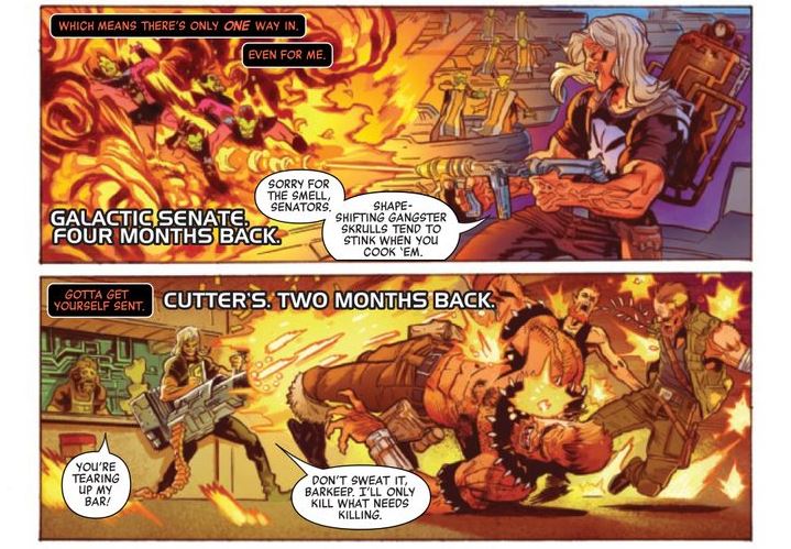 In the second issue of the Revenge of the Cosmic Ghost Rider, Frank gets into a tussle with the cosmic King, the Universe’s most powerful Crime Lord. He then falls back to his basic tactics of taking down a cartel. Frank starts from the bottom up and decides to take down Cosmic King’s criminal empire from below, first targeting his agents and then going for the head of the snake. Kammi, another individual that saved Frank Castle from almost certain death, is now his partner in crime.