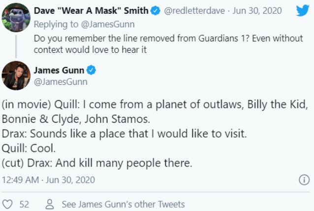 It’s kinda interesting that Disney did let many crazy jokes pass, but ordered to cut out one line from Drax. Maybe they thought that this line seems a bit sadistic and they needed kids to like Drax, not fear him. But then again, it is okay. As Gunn said, he was willing to compromise because Disney gives him enough freedom anyway, so he could surely listen to the one little thing they’ve asked of him.