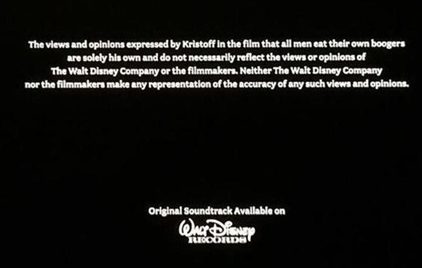 Walt Disney ensured that they add a disclaimer stating that the views of Kristoff about men eating their own boogers belong solely to the character and do not necessarily reflect the opinions of The Walt Disney Company or the filmmakers.