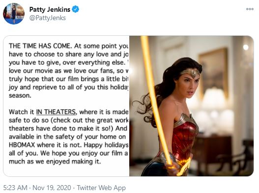 “IT’S TIME. We’ve all waited a long time for this one to come. I can’t tell you how excited I am for all of you to see this movie. It wasn’t an easy decision and we never thought we’d have to hold onto the release for such a long time but Covid rocked all of our worlds. We feel the movie has never been so relevant and we hope that it’ll bring some joy, hope and love to your hearts. Wonder Woman 1984 is a special one for me and I can only hope it’ll be as special to you too. We’ve put our hearts and souls into it. So… you can watch it IN THEATERS (they’re doing an amazing job keeping it safe) and you can watch it on HBOMax from your homes. Sending you my love. Please keep safe and wear a mask. Happy holidays to all of us! Let the light shine in.”