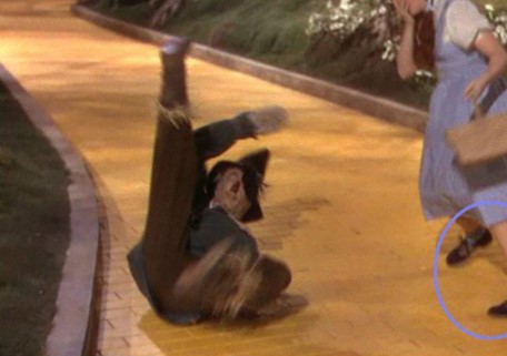 In the movie, we witness the Scarecrow (Ray Bolger) tease the apple trees, who in retaliation try hitting him with the apples they had on their branches. In one particular scene when the scarecrow takes a fall, we can witness Dorothy (Judy Garland) not wearing her infamous ruby shoes.