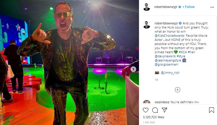 The six-time Kids’ Choice-nominated actor, who was awarded his first Orange Blimp Award in 2013 when he was voted “Favorite Male Butt-Kicker” for his role as Tony Stark in Iron Man 3, also appeared during last year’s virtual ceremony when he reunited with the cast of the Favorite Movie Award-winning Avengers: Endgame. He got slimed while accepting his award for Favorite Movie Actor at the 2021 Nickelodeon Kids’ Choice Awards After his 2020 nomination for Favorite Superhero — a prize awarded to Spider-Man star Tom Holland — Downey won Favorite Movie Actor when presented with the award by Tiffany Haddish at the 2021 KCAs: Thanking Universal Pictures, his wife and producing partner Susan Downey, and Nickelodeon, Downey also made special mention to “all the kids that saw Dolittle and voted.”