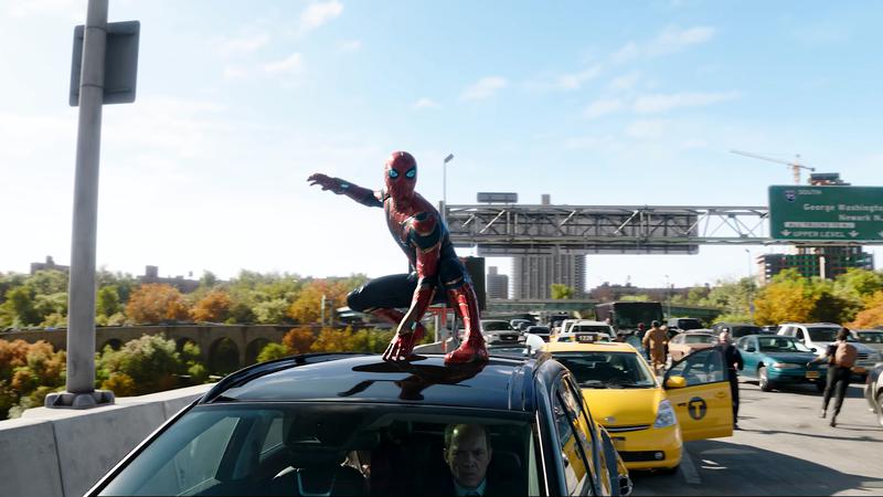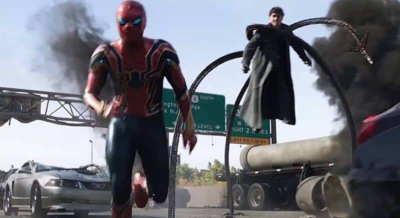 The scene was supposed to cause so much destruction that the flames rose as high as the clouds. This shot confirms that it was not just the freeway, but also the neighboring areas that endured damage from their fight. Also, take a closer look at the collapsing freeway, as Spider-Man tries his very best to save it. God, I got chills just by looking at it.