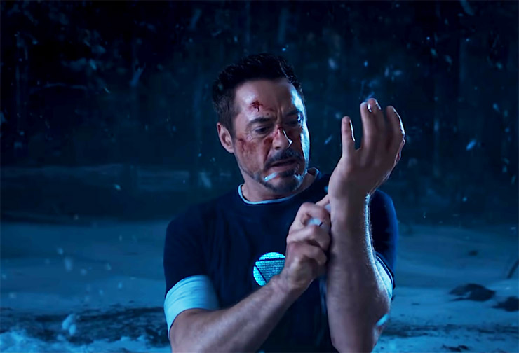 This movie featured his arm under duress twice! First, we see him fall directly on his left arm when he lands in Tenessee. Afterward, in the following scene, we see him using snow as an ice-pack for his shoulder. If this wasn’t enough for the developers, the arm suffers another injury when Aldrich Killian rips off the suit from his left arm.
