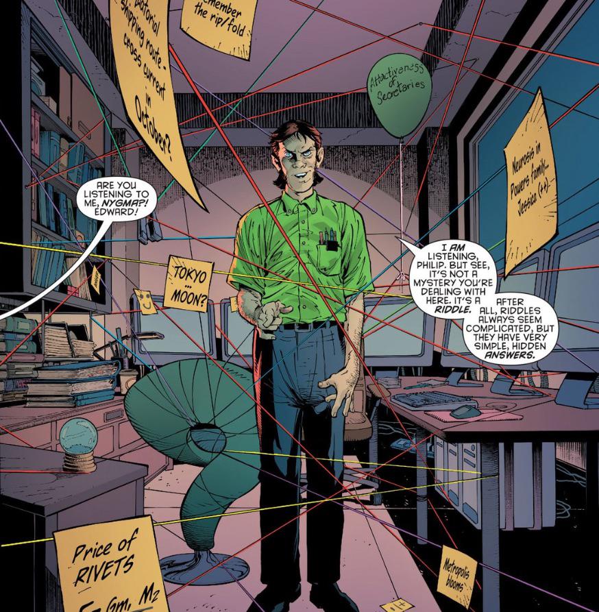 Edward Nashton’s character is introduced as someone who is brought up in an orphanage. This orphanage is actually visited by Bruce and his parents when Thomas Wayne was going to announce his run for mayor. Nashton was also was always enthusiastic about riddles and this actually leads him to be the target of a lot of bullying. He was given names like Ed-“Wierd” due to his persona. Later in the story, he gets a job as a food delivery guy. He does this job while finishing his study and attending college. This is also the time when he comes across Bruce Wayne again.