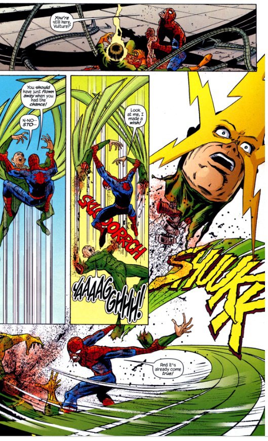 Another entry on this list from the famous Marvel Zombies storyline but this one is a bit more disturbing than a family embracing the Zombie virus. When Spider-Man was infected and became a Zombie he decided to chase down his foes and tell them what’s what. In a moment of fervor Spider-Man chases down Vulture and Electro. He rips the Vulture’s arms off and lobs Electro’s head straight off of his shoulders. One never sees Spider-Man going this crazy.